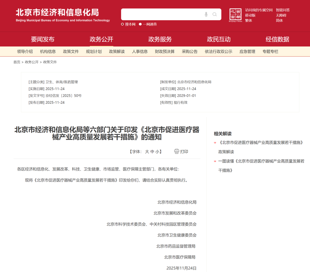 北京市经济和信息化局等六部门关于印发《北京市促进医疗器械产业高质量发展若干措施》的通知