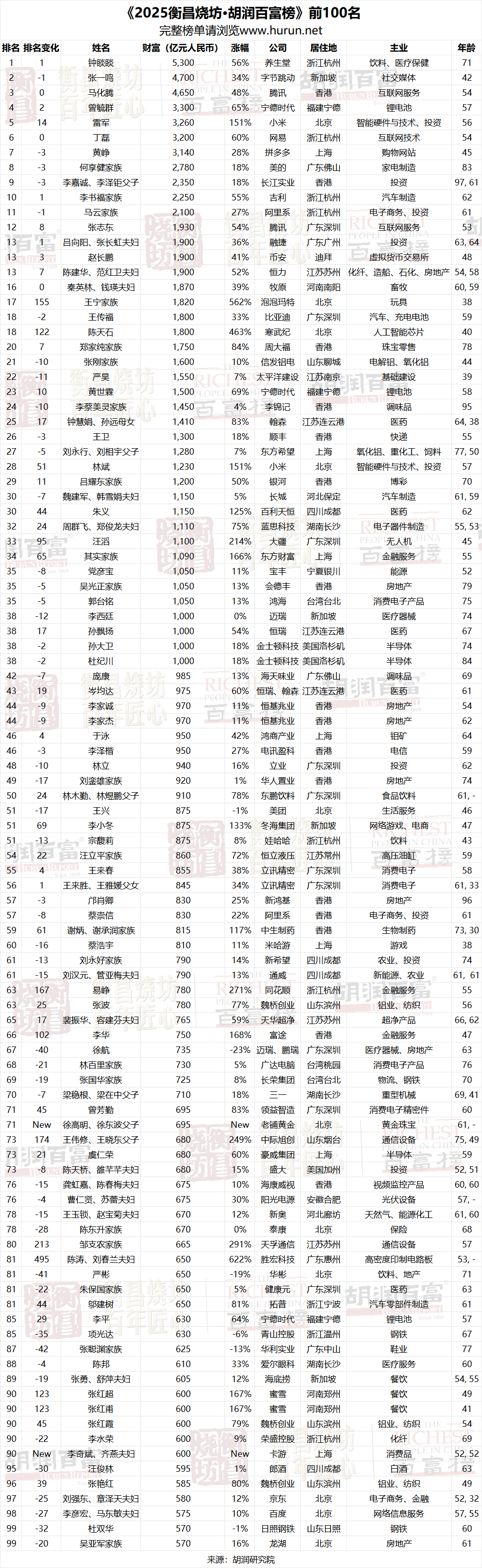10月28日,胡润研究院携手高端酱香白酒品牌衡昌烧坊,联合发布《2025衡昌烧坊·胡润百富榜》(HENGCHANG SHAOFANG · Hurun China Rich List 2025)。今年是胡润研究院自1999年以来连续第27次发布“胡润百富榜”,财富计算截止日期为2025年9月1日。
