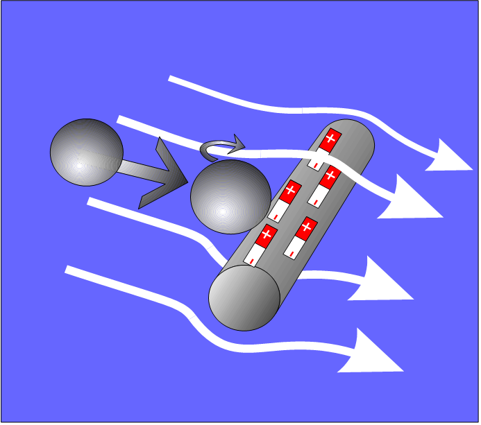 拦截效应:当较大粒子沿着流线运动到纤维表面,较大粒子被过滤材料机械筛滤作用拦截而沉积下来,原理示意图如图3所示;惯性效应:当粒子质量较大或者速度较大,在流线拐弯时,粒子由于惯性作用脱离流线撞击到滤材表面,因吸附力停留在撞击表面,原理示意图如图4所示;扩散效应:由于气体分子热运动对粒子的碰撞而产生的粒子的布朗运动,粒子布朗运动扩散位移到过滤纤维中被吸附,对于越小的粒子越显著,原理示意图如图5所示;静电吸附效应:粒子被过滤材料的静电作用吸附而沉积下来,原理示意图如图6所示。