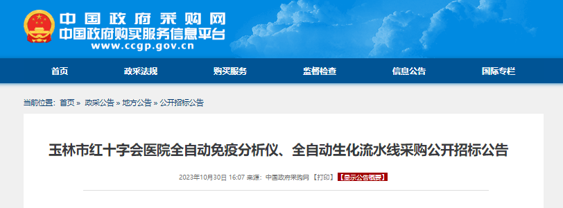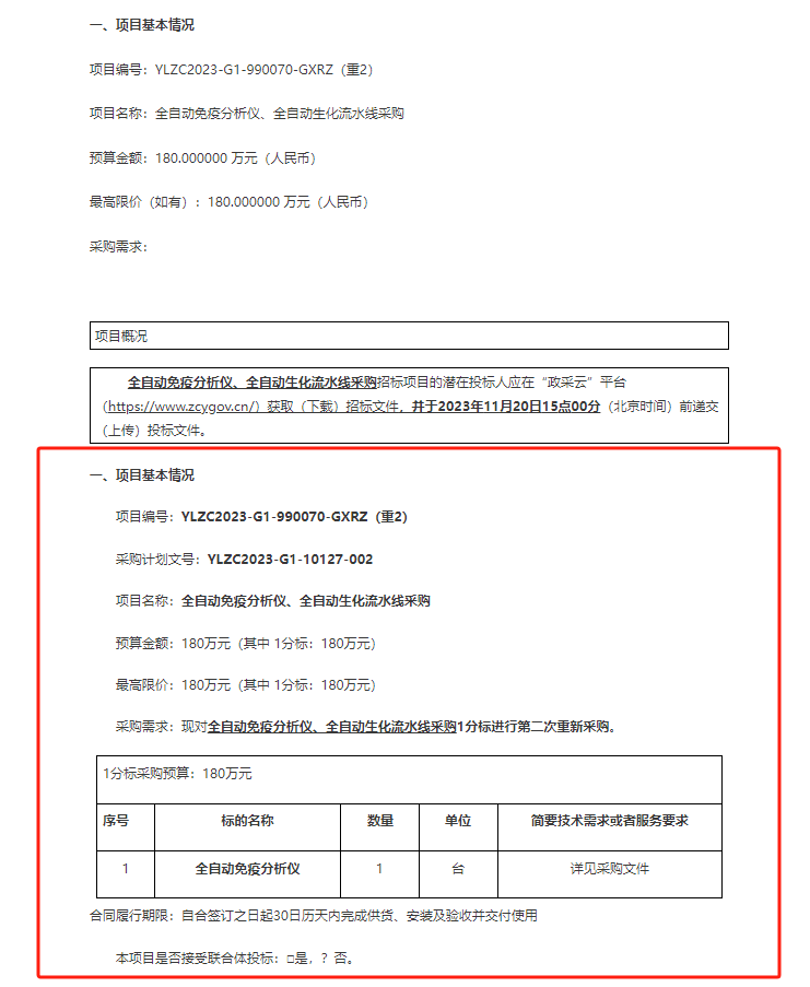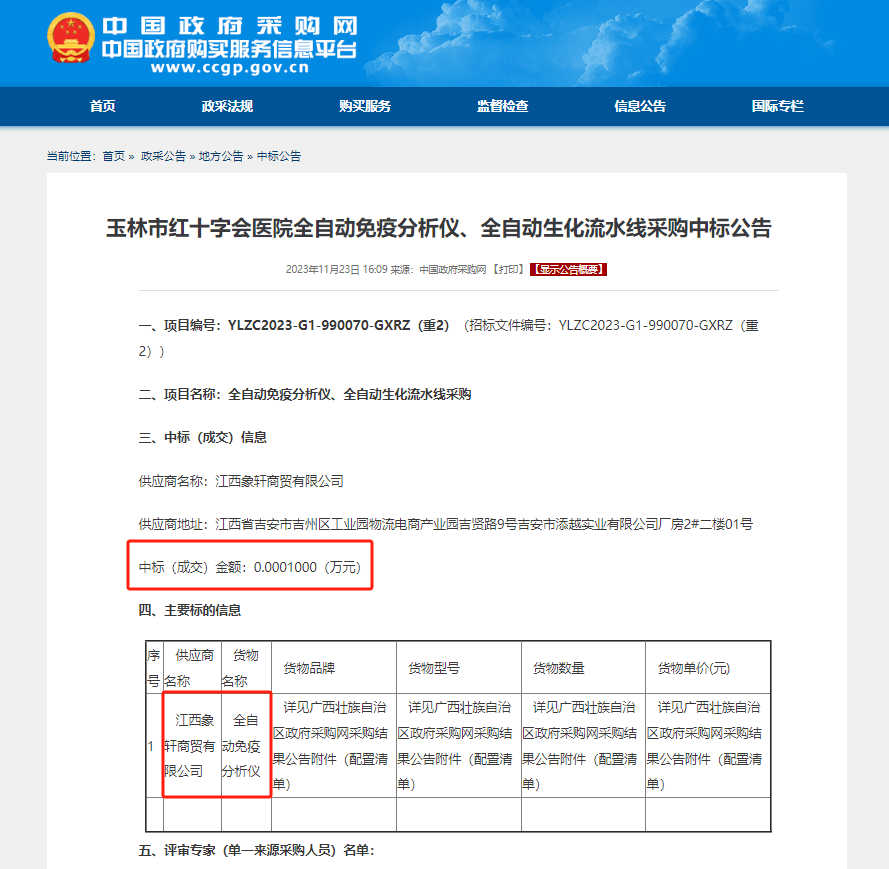 11月23日,中国政府采购网发布了一则关于《玉林市红十字会医院全自动免疫分析仪、全自动生化流水线采购中标公告》。其中写明,本项目中标品牌为某IVD企业,中标金额为0.0001000万元,也就是1元!