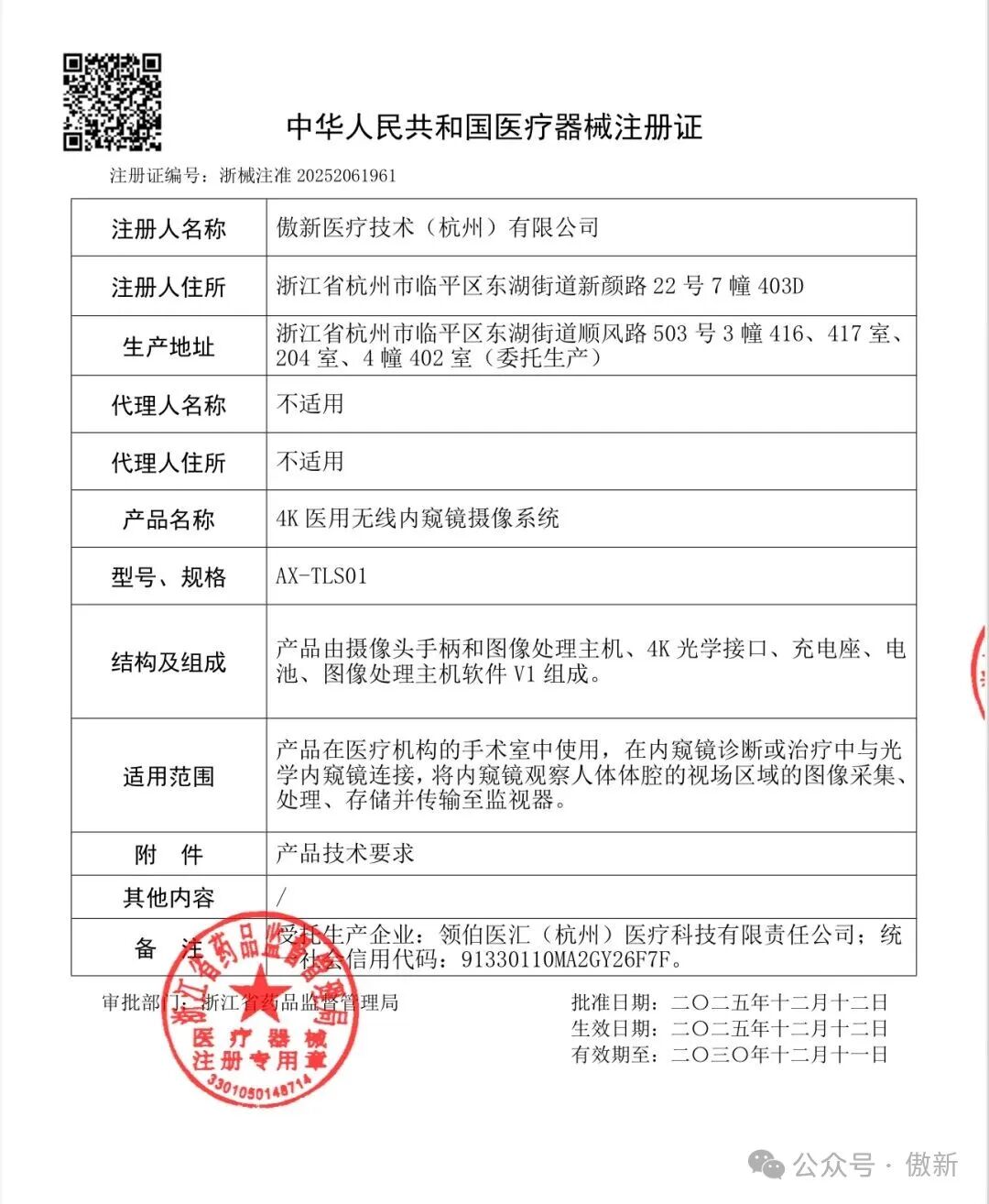 第四年企业,五年专利,十年研发,傲新破土而出。我们无比自豪地宣布:傲新医疗技术(杭州)有限公司自主研发的「4K医用无线内窥镜摄像系统」,历经淬炼,终获认可,正式获得中华人民共和国二类医疗器械注册证!在微创手术领域医疗领域,傲新一直致力于成为一线医疗工作者提供创新且全面的解决方案。2021年获得国家发明专利,是国内外第一也是内窥镜摄像系统产品集大成者,创新无线理念全球领先。