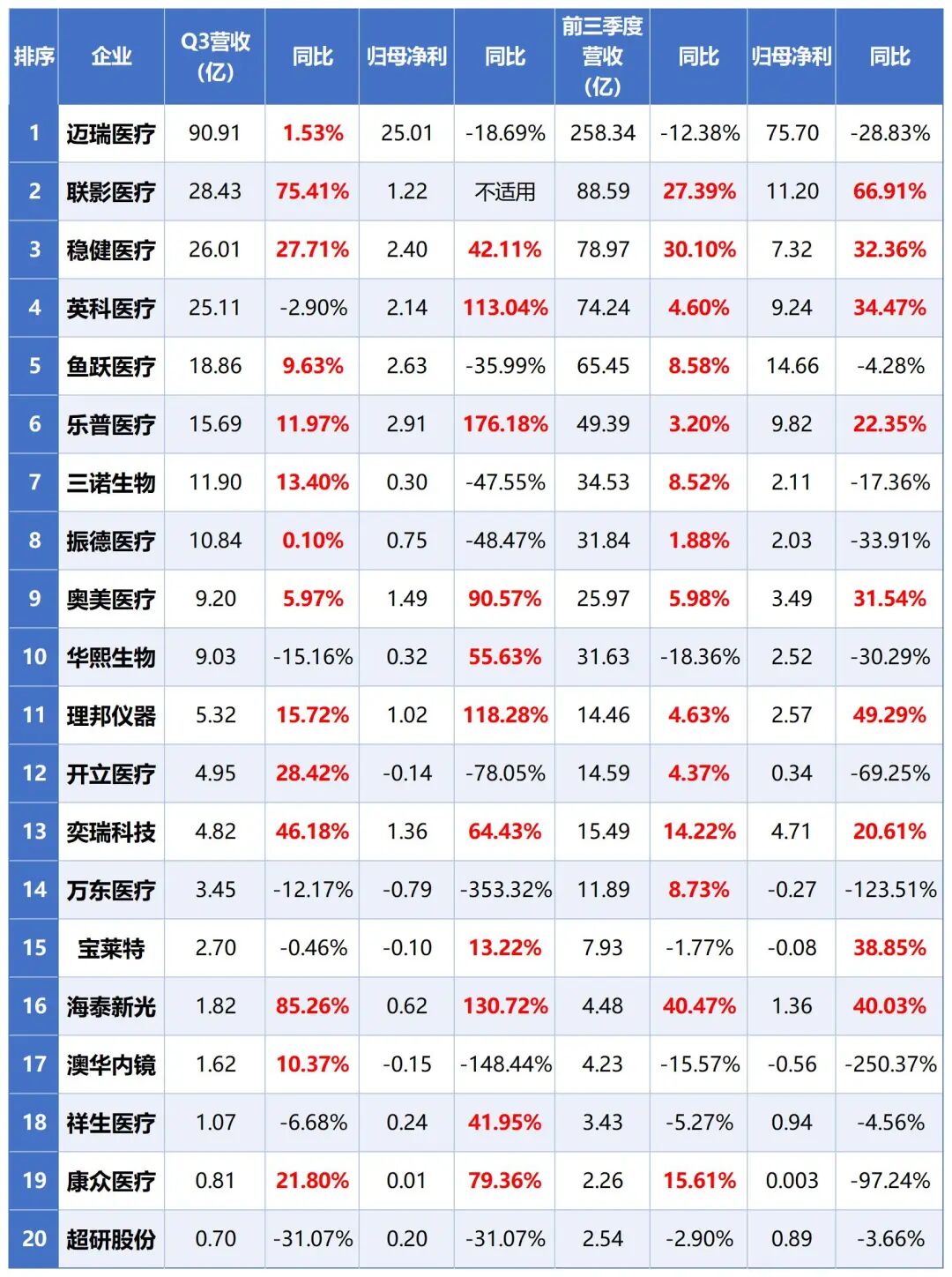 三季度上市械企业绩排行,迈瑞、联影领跑