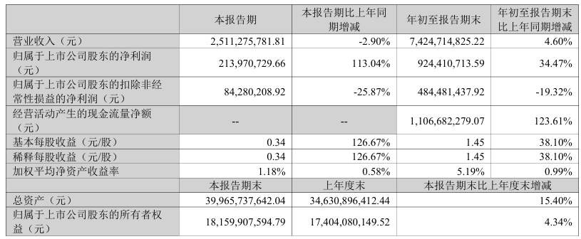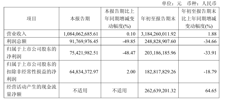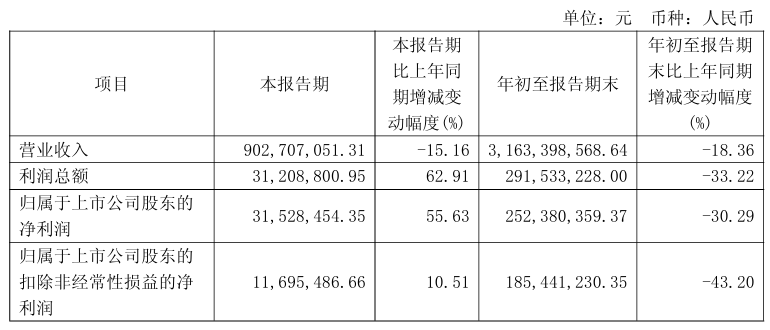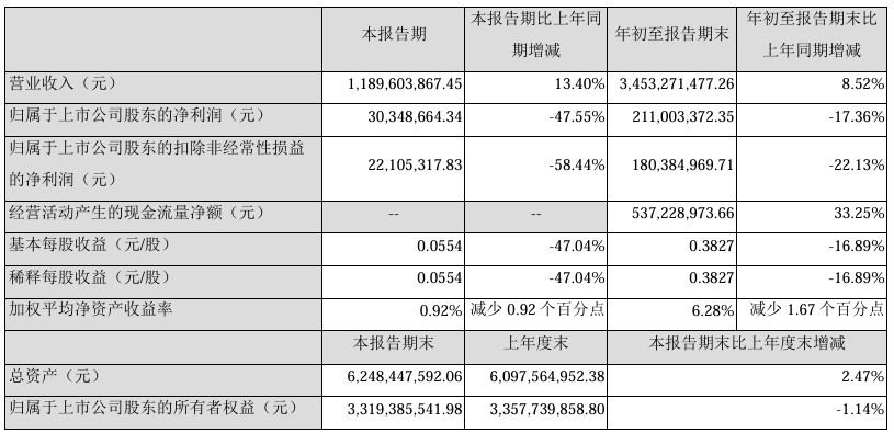 前三季度,公司营业收入34.53亿元,同比增长8.52%;归母净利润2.11亿元,同比下降17.36%。其中第三季度实现营业收入11.9亿元,同比增长13.40%;归母净利润3034.87万元,同比下降47.55%。
