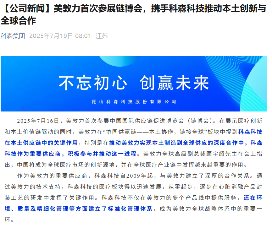 在合作深度上,科森不仅服务于美敦力全球10多条产品线,更参与到心脏消融产品封装工艺的核心研发中,还通过美敦力的体系赋能,建立起符合国际标准的环境、质量及精细化管理体系,成为其全球供应链中不可或缺的一环。