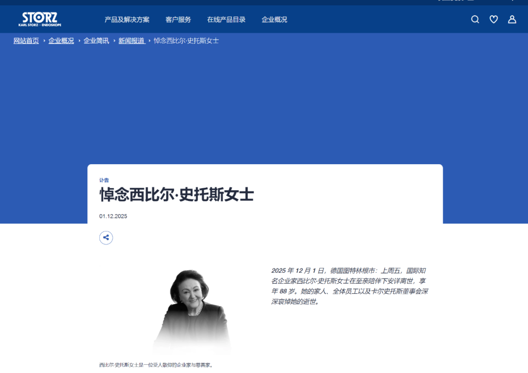 2025年12月1日,KARL STORZ在其官网宣布国际知名企业家西比尔·史托斯女士在至亲陪伴下安详离世,享年 88 岁。她的家人、全体员工以及卡尔史托斯董事会深深哀悼她的逝世。