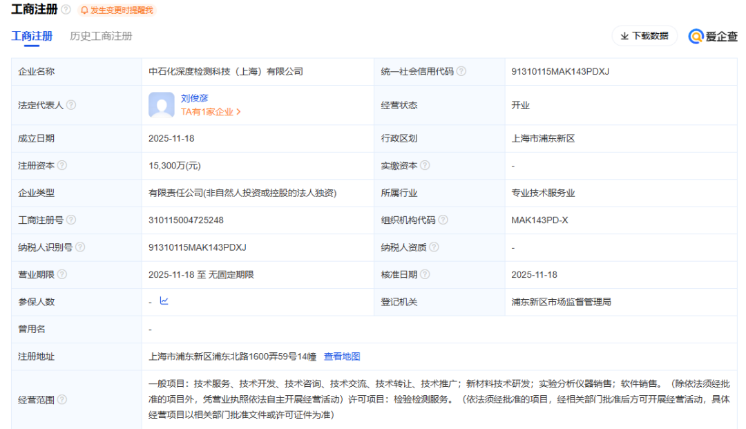 石化深度检测科技 (上海) 有限公司正式成立,注册资金1.53 亿,由中石化
